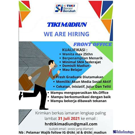 Tiki Madiun terus berupaya memberikan informasi terbaru seputar pengiriman barang dan dokumen. Anda bisa mengakses situs resmi Tiki Madiun atau mengikuti akun media sosial untuk mendapatkan update terbaru tentang layanan, tarif, promo, dan informasi lain yang relevan dengan kebutuhan pengiriman Anda.